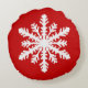 A delicate, lacy snowflake pattern on a solid background with a striated, Ikat woven texture - white snowflakes on a dark Christmas red / crimson background round pillow