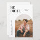 Carte de faire-part moderne de graduation avec cadre en arc blanc pour votre photo. Le texte dit "IL L'A FAIT."
