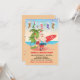 Super fun Tropical Beach thème de Fêtes de Noël invitation avec Père Noël prêt à Surf, palmier et pendre les bas de Noël, le tout sur une plage arrière - plan de l'océan.