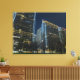 This image showcases a cityscape at night, dominated by several tall skyscrapers. The buildings are illuminated with lights, creating a contrast against the dark sky. Trees and greenery are visible in the foreground, suggesting a park or urban green space. The overall mood is calm and serene, capturing the quiet beauty of the city after dark. The buildings have a modern architectural style.