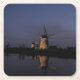 Coaster with illuminated historic windmills with reflection in the water of the river during the Blue Hour at the beginning of the night in Kinderdijk in the Netherlands.