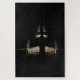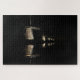 Challenging jigsaw puzzle with the famous windmills of Kinderdijk in a row along the canal with reflection in the water, illuminated in the dark night, creating a surreal scene in the Netherlands. Hard jigsaw puzzle to complete because of the many black pieces.