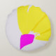 Ce coussin rond est composé d'une grande fleur de pétales jaunes et d'une tige fuchsia qui s'ouvre sur sa surface lilas.
