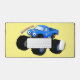 Ce mignon camion monstre bleu est prêt pour l'action de course. Camionneur de course haute octane amusant dessiné dans le style de dessin animé heureux!