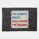 Black kitchen towel featuring design with the text "I'm Always Right. Even When I'm Wrong" in blue and red.