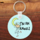A stick figure angel holds on to the yellow moon on a background of blue and black text reads "I'm an Angel!" on an adorable angel design keychain that makes a great gift for angel lovers!