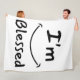 This fleece blanket showcases the words "I'm Blessed" in a unique mansalva print font with black letters plus smile icon in the centre with in bible faith based saying theme. This Blanket is made from 100% buttery soft and cozy polyester fleece with edge-to-edge vibrant full colour sublimation printing and double edge stitching with a off-white coloured back machine washable.
