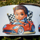 This adorable African-American toddler is ready to win the big race in his red sports car.