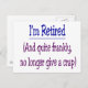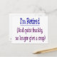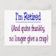 Retirement shirts, mugs, hats, tote bags, cards, key chains, hilarious sayings, "I'm retired and no longer give a crap"....