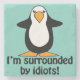 I'm surrounded by idiots! Funny and sarcastic insult with a black and white penguin with orange feet and beak graphic with a turquoise blue/green background cyan colour. Fully customizable.
