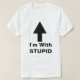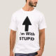 The classic phrase in easy to read text with the arrow pointing to the wearer.