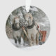Ancienne image de couleur rouge de traîneau d'hiver, tirée à travers la neige dans une forêt d'arbres recouverts de neige par deux chevaux blancs à manches.