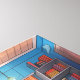 L'image représente une chambre confortable et colorée avec un mur bleu vif orné de nuages et une fenêtre donnant sur un paysage urbain. La chambre dispose d'un lit confortable avec une couette orange, d'une bibliothèque débordant de livres et d'une collection de plantes en pots apportant une touche nature. L'impression générale est celle d'un espace gai et accueillant, reflétant la personnalité de son habitant.