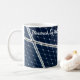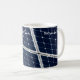 Closeup view of a solar power panel to generate ecologically clean and renewable energy to feed street lamps and other devices. Deep blue background and a white grid. Coffee mug. Customizable. You can change the image and you can change or delete two template texts independently: Powered by the Sun and Yes, you are the best.
