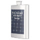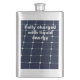 Closeup view of a solar power panel to generate ecologically clean and renewable energy to feed street lamps and other devices. Deep blue background and a white grid. Funny customizable hip flask. You can change or delete the template text Fully charged with liquid energy.