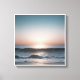 This image captures a serene coastal scene at sunset. The sky is painted with soft hues of pink and blue, creating a calming backdrop. The sun, low on the horizon, casts a warm glow on the gentle waves that roll towards the shore. The water glistens with a subtle sparkle, reflecting the light from above. The sandy beach stretches into the distance, offering a sense of tranquillity and peacefulness.