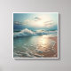 The wet sand in the foreground reflects the warm, golden light of the setting sun, creating a shimmering path that leads the eye toward the horizon. The sky is filled with a dramatic interplay of light and shadow, with dark clouds on the left contrasting with the bright, sun-kissed clouds on the right. This composition combines the dynamic motion of the waves with the peaceful glow of the sunset, creating a captivating and tranquil atmosphere.
