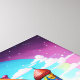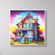 The house itself is a two-story structure painted in an extravagant palette of electric blue, hot pink, sunny yellow, and orange, with intricate decorative patterns. It is surrounded by a surreal garden with trees and flowers in equally bright pinks and oranges. The background features a striking sky transitioning from deep purple to golden yellow, with fluffy clouds and a soft rainbow arc. The overall style is highly stylized and maximalist, evoking a sense of childlike wonder and fantasy.