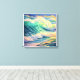 The central focus is the massive, translucent wave, whose tube glows with intense light green and yellow-green as it crests. The surrounding water is a deep teal and blue, contrasting sharply with the brilliant white and soft yellow-orange foam and spray that catches the light. The foam is prominent, highlighting the wave's powerful motion. The overall atmosphere is one of dramatic, luminous energy, with the water and sky painted in broad, saturated, and highly stylized strokes.