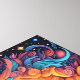 The central element is a brilliant, glowing yellow sun with sharp, radiating light rays, set against a dark starry night sky. This cosmic view is framed by a circular border composed of dense, intricate, flame-like swirls and clouds in a vivid, high-saturation palette of deep purples, rich blues, fiery oranges, and soft pinks. The overall effect is a highly decorative, surreal window between two dimensions, blending cosmic and mythological elements in a bold, maximalist art style.