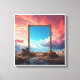A highly surreal and artistic image featuring a large, ornate golden picture frame standing vertically in a desolate, muddy landscape. The frame acts as a window to a contrasting reality: it perfectly encloses a vibrant, deep blue sky filled with bright, fluffy white clouds. Outside the frame, the sky is dominated by dramatic, cotton-candy pink and deep purple clouds, suggesting either sunrise or sunset. The foreground is a barren expanse of dark, moist earth with small pools of reflective water, while a subtle, hazy skyline of distant buildings is visible on the horizon to the right, adding to the sense of a portal or a dreamlike separation of worlds.