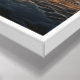 A dramatic and surreal image captures a wooden picture frame standing upright amidst turbulent ocean waves during a vibrant sunset. The frame perfectly encircles the bright orange sun descending towards the horizon, making the sun the focused centerpiece within the border. Dark, frothy waves crash around the frame's base, contrasting sharply with the warm, fiery hues of the sky and the glowing sun. The overall effect is a striking juxtaposition of art, nature, and raw power.