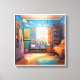 The image depicts a cozy and colourful bedroom with a vibrant blue wall adorned with clouds and a window overlooking a cityscape. The room features a comfortable bed with an orange duvet, a bookshelf overflowing with books, and a collection of potted plants adding a touch of nature. The overall impression is one of a cheerful and inviting space, reflecting the personality of its inhabitant.