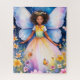 Jigsaw puzzle d'une jeune fille aux ailes de papillon se dresse dans un jardin animé, entouré de fleurs colorées et d'étoiles brillantes. Sa robe est multicolore, et elle porte une couronne de fleurs dans ses cheveux bouclés.