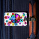Imagine Peace Symbol and Bright Retro Flowers iPhone cases and electronics cases, aprons, key chains and buttons. Artist designed in bright, bold colours for whimsical and fun gifts.