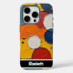 This bold phone cover showcases a heavily textured, impasto oil painting style, featuring distinct raised circular and rectangular shapes in a vibrant palette of yellow, orange, red, blue, and white. The artistic, geometric design adds a tactile and colourful flair to your device. A sleek black bar at the bottom offers personalization with a name like "Elizabeth"; if you don't want a name, you can remove it and any other elements you don't like from within the design tool, crafting a truly bespoke smartphone accessory.