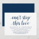 Carte d'invitation de mariage en fuite sur le thème du script bleu marine moderne (Impossible d'arrêter cet amour). Elle est parfaite pour votre dîner de mariage en fuite décontracté au bord du lac, la danse et la fête.
