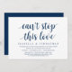 Carte d'invitation de mariage en fuite sur le thème du script bleu marine moderne (Impossible d'arrêter cet amour). Elle est parfaite pour votre dîner de mariage en fuite décontracté au bord du lac, pour danser et faire la fête.
