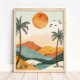 Un soleil en terre cuite lumineux se lève au-dessus de montagnes désertiques stratifiées dans cette impression de paysage bohème moderne et chaleureuse. Des vallées de teinte sarcelle douce, des tons neutres sablonneux et des tons orange terreux créent une atmosphère apaisante inspirée du Sud-Ouest avec une touche méditerranéenne subtile.