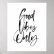 Good Vibes Uniquement l'impression d'affiche de typographie présente une typographie moderne en noir et lettré à la main, une citation inspirante à accrocher sur votre mur. © Mini Moi Prints