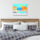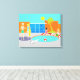 Entrez ! L'eau est correcte ! Cette Retro Pool Party Stretched Canvas Print présente un dessin animé animé animé animé d'une fête de piscine amusante et sophistiquée. Le design moderne du milieu du siècle s'articule autour d'une piscine ronde sur un grand patio gris en béton. La piscine est remplie d'eau turquoise. Des briques orange entourent la piscine et il y a un plongeoir blanc à planches prêt pour une âme aventureuse. Une balle de plage rouge et blanche flotte dans l'eau. De l'autre côté de la piscine, deux fêtards se baladent les pieds dans l'eau, allongés sur des serviettes de plage rayées rouges et blanches. La femme aux cheveux noirs porte un maillot de bain rose et une pièce. A côté d'elle, une boisson tropicale dans une noix de coco avec un petit parapluie et une paille verte. L'homme blond porte des troncs verts et lumineux. On lui donne un coup de pied avec les mains derrière la tête. À gauche de la piscine, se trouve un homme distingué aux cheveux blancs et aux maillots de bain en jade qui tient un verre en coquille de coco. Nous savons qu'il est distingué parce qu'il est un homme aux cheveux blancs ! Il s'adresse à une femme aux cheveux blonds et à une figure en sablier en maillot de bain turquoise. Le poumon sur son bras est une serviette de plage jaune> Derrière cette scène se trouve la silhouette verte d'un palmier et d'une maison futuriste en brique orange. Par les grandes baies vitrées bleues, on aperçoit la silhouette d'une télévision, d'une chaise, d'un ottoman et d'une starburst clock. Le ciel derrière la maison est un turquoise sans nuages avec un soleil rond et jaune.