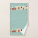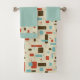 Cette serviette de bain a un look du milieu du siècle avec un design graphique dans un carré et rectangles géométriques. Les couleurs sont bleu ciel, rouille et marron. Certains blocs sont de couleurs solides et quelques contours. La serviette est bleu massif avec une bordure de la conception graphique. Le linge est bleu dur. Le moderne du milieu du siècle est un style qui a été populaire de 1950 à 1969. Il fait un retour en popularité aujourd'hui.