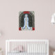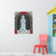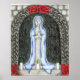Une statue de prière est entourée de bougies sous une arcade de nouage celtique. Avec des noeuds rouges en forme de tulipe.