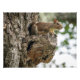A brown squirrel is perched alertly on the rough bark of a tree, peering out from a branch as it surveys its surroundings in a natural forest setting.