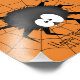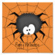Caricature fantasque araignée noire avec de grands yeux drôles et de petits crocs blancs, rampant sur sa toile. En dessous de l'araignée se trouve un modèle qui lit Happy Halloween. Il peut être utilisé tel quel ou remplacé par votre propre texte.