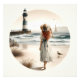 Une jeune femme gracieuse, vêtue d'une robe blanche qui coule le long du rivage sablonneux, son casquette du soleil penche contre la brise en contemplant un phare rayé debout contre les vagues. Des herbes douces encadrent l'avant-plan tandis que des oiseaux marins et un voilier dérivent à travers l'horizon, ajoutant un sentiment de mouvement calme au paysage côtier. La douce aquarelle mêle romantisme et sérénité, créant une scène balnéaire intemporelle d'inspiration cottagecore, à la fois nostalgique et rêveuse. L'IA a généré des oeuvres d'art.