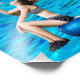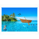 Une illustration numérique présente une scène tropicale vibrante avec une femme, un bateau et divers éléments de la nature. La femme, qui semble être caucasienne avec la peau claire et les cheveux bruns, a environ 25 ans. Elle est assise sur un ballon bleu dans l'eau, portant un soutien-gorge gris et des shorts noirs. L'eau est turquoise, claire, ressemblant à une piscine qui s'étend jusqu'à l'horizon, se mélangeant harmonieusement à l'océan. Des palmiers et une végétation luxuriante sont visibles dans l'arrière - plan, avec un perroquet coloré perché sur l'un des arbres. Un papillon bleu flotte dans le ciel. Un bateau à rames en bois est positionné dans l'eau, qui semble flotter. Derrière le bateau, trois queues de baleines émergent de l'eau, ajoutant une touche de fantaisie à la scène. Le ciel est bleu clair avec quelques nuages épars. L'ensemble est caricatural et animé, avec une attention particulière portée aux couleurs vives et aux lignes claires. La composition est équilibrée, avec les différents éléments disposés pour créer un sens de profondeur et d'harmonie. L'éclairage est lumineux et même, ce qui renforce l'atmosphère joyeuse et idyllique de la scène.