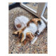 Un chat calico serein confortablement enroulé sur un sol à motifs de mosaïques dans une ambiance cosy. Les tons et les textures chaudes créent une scène paisible et artistique, parfaite pour les amateurs de chat et d'art.