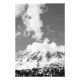 Une photo en noir et blanc du Mont Rainier avec des nuages se formant et se rassemblant à son apogée. Une série de nuages a échappé à l'emprise du volcan et s'élève plus haut dans le ciel. La neige couvre toujours le paysage, et la croissance des arbres se répand au premier plan. Copyright ©2023 Kimberly J Tilley. zazzle.com/store/developingnature
