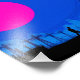 Un paysage industriel complexe est représenté par des structures imposantes, encadrées par un ciel vert. Un cercle bleu audacieux contraste avec les nuages texturés de l'arrière - plan.