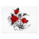 Contour, croissant de lune mécanique avec engrenages, décoré de roses rouges avec tiges et feuilles noires épineuses sur fond blanc. Steampunk