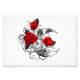 Contour, lune de croissant mécanique avec des engrenages, décoré de roses rouges avec des tiges noires spirées et feuilles sur arrière - plan blanc. Steampunk