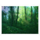 Les rayons du soleil matinal se répandent dans une forêt estivale d'une verdure éclatante, avec des arbres massifs recouverts de lierre et une épaisse couverture de sous-bois. Une photographie numériquement manipulée pour donner aux feuilles de la vigne, de la brume bleu-vert, des rayons dorés et des arbres verts printaniers une qualité de rêve.