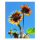 Deux petits tournesols rouges foncés, dont les pointes de leurs pétales sont ombragées de jaune, se dressent contre un arrière - plan du ciel bleu. Photographie de tournesol colorée prise l'été 2012 à Corralitos, CA.