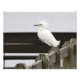 Un feu enneigé perché sur un rail crée une scène pittoresque, mêlant l'élégance de l'oiseau à la simplicité de son environnement. L'arbre enneigé, connu pour son plumage blanc immaculé, ses longues pattes noires et ses pieds jaunes distinctifs, se distingue par son arrière-plan de rail.