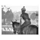 Ce cheval soufflait le jour d'ouverture à Saratoga avec une cavalière. Ressentez la puissance et l'excitation dans cette photo captivante de cheval et cavalier. Photo terminée en noir et blanc pour créer une ambiance matinale avec cheval et cavalier. Fleetphoto